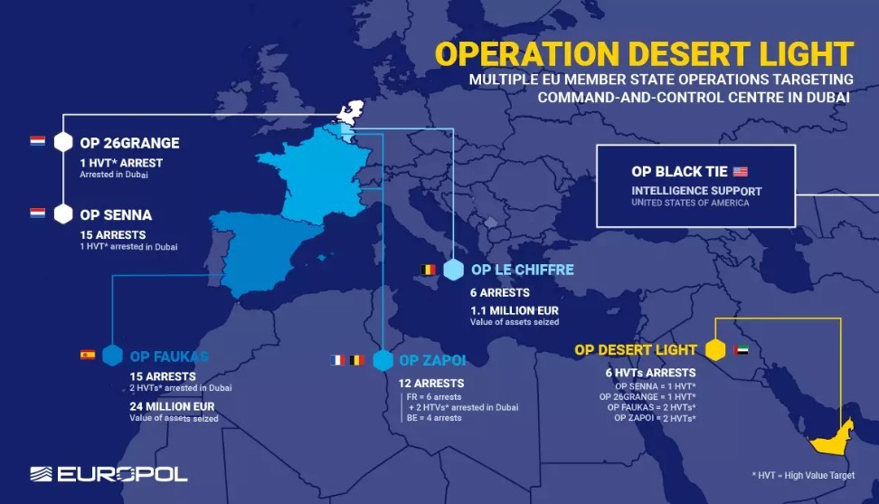 Navodi se da su policijske snage uključene u “Operaciju pustinjsko svetlo” ciljale i “komandno-kontrolni centar i logističku infrastrukturu trgovine drogom u Evropi”.
