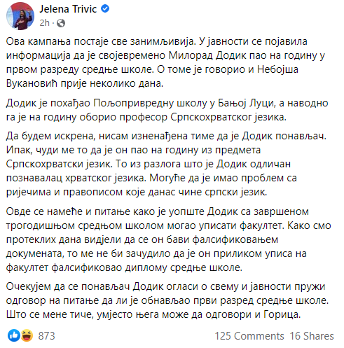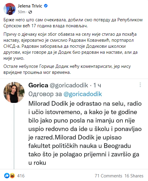Kako je Trivićeva i sama na početku statusa naglasila da "ova kampanja postaje sve zanimljivija", prozvavši Dodika i njegovu kćerku, i sama nije očekivala tako brzu reakciju i odgovor.