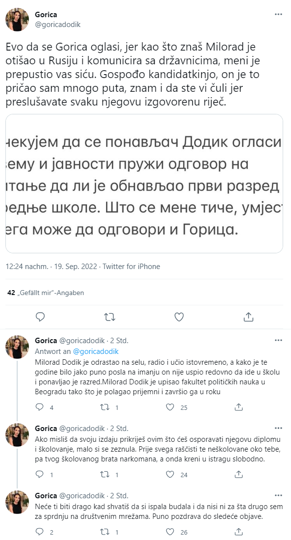 Dodikova je oštro odgovorila Trivićevoj, ovaj put na društvenoj mreži Tviter, objasnivši da je Dodik već mnogo puta govorio o svom životu i školovanju, a ovaj potez Trivićeve, između ostalog, označila je kao pokušaj da se "prikrije njena izdaja".