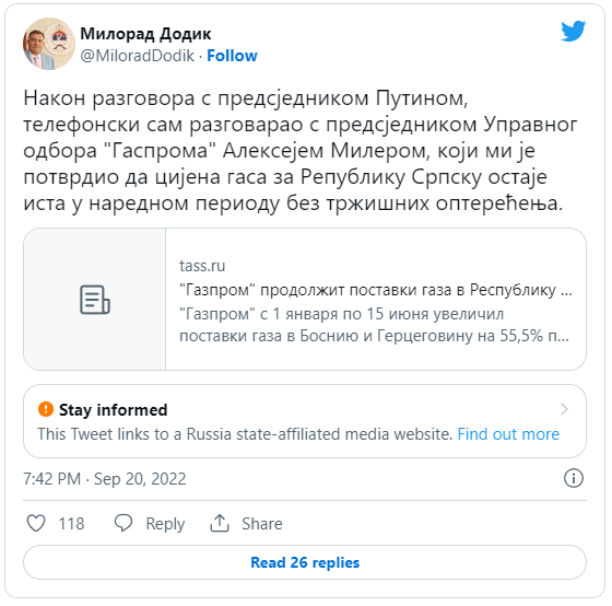 Dodik je na Twitteru naveo da je razgovarao telefonski sa Milerom nakon sastanka sa predsjednikom Rusije, Vladimirom Putinom.