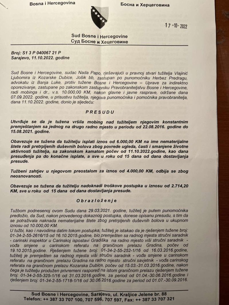 Ljubomir Vlajinić je tako postao prvi službenik koji je pred Sudom BiH dobio UIO BiH po tužbi zbog višegodišnjeg mobinga.