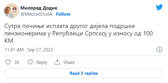 "Sutra počinje isplata drugog dijela podrške penzionerima u Republici Srpskoj u iznosu od 100 KM", naveo je Dodik na Twitteru.