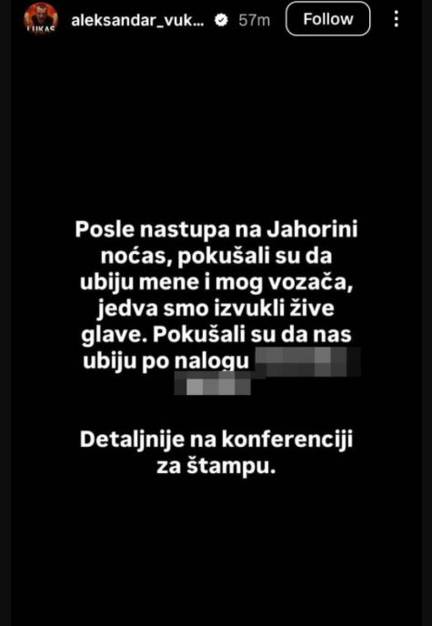"Posle nastupa na Jahorini noćas, pokušali su da ubiju mene i mog vozača, jedva smo izvukli žive glave. Pokušali su da nas ubiju", napisao je Lukas.