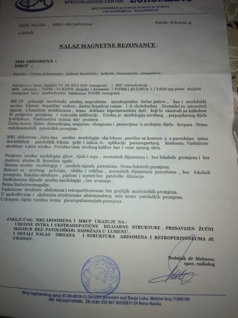 "Nakon hodanja po bolnicma i laboratorijama, ustanovljeno je imam presavijenu žučnu kesu, dijagnostifikovan mi je giht, metabolički poremećaj, masna jetra i hiberinzulizam. Zbog svega toga ne moru normalno da funkcionišem i narušeno mi je zdravlje", kazala je Nataša za vecernjenovosti.ba.