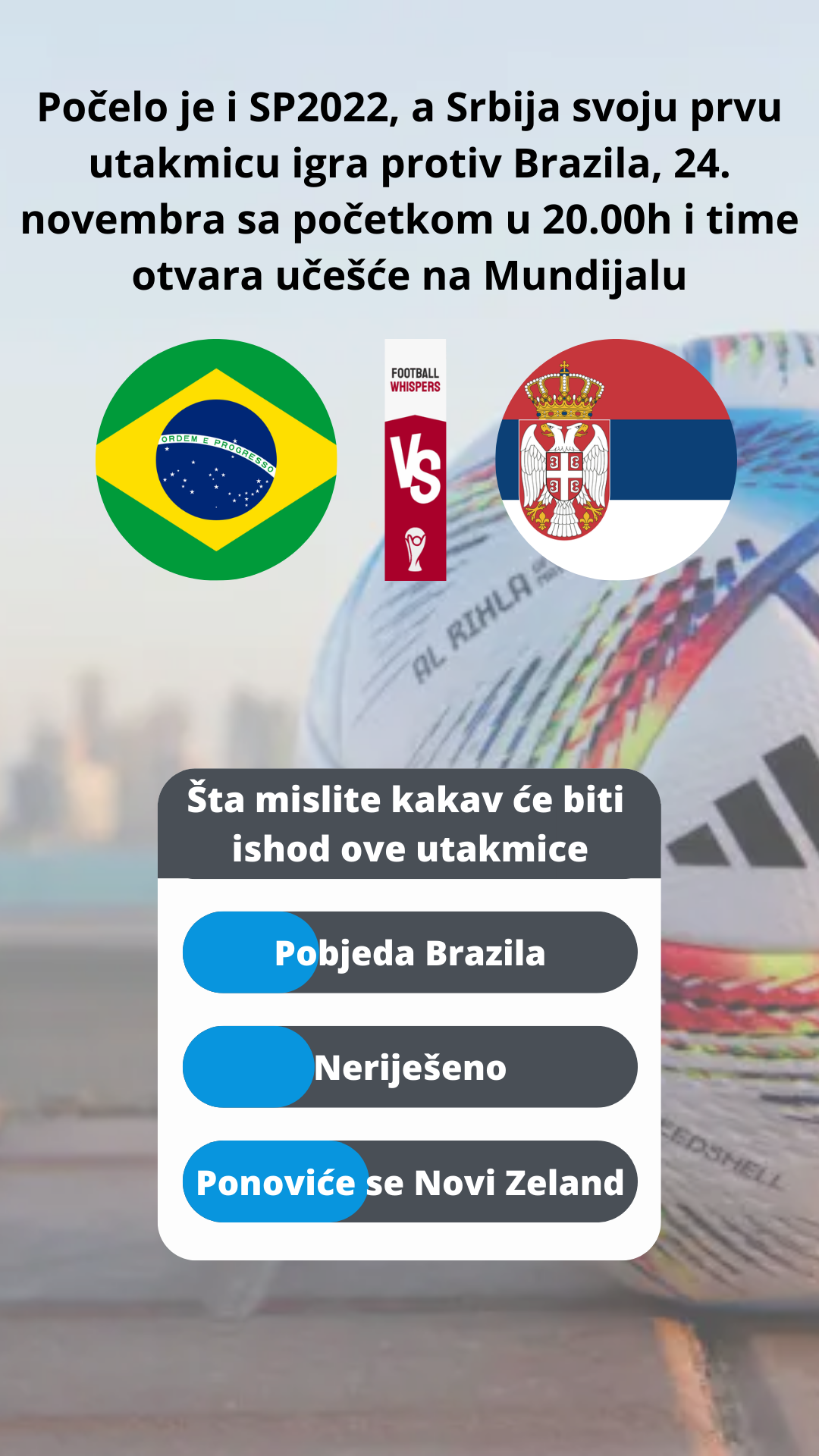 Prema anketi u kojoj su učestvovali naši čitaoci, te na pitanje šta misle kakav će biti ishod utakmice, smatraju da će reprezentacija Srbije ipak pobijediti, kao i 2015. godine na Novom Zelandu.
